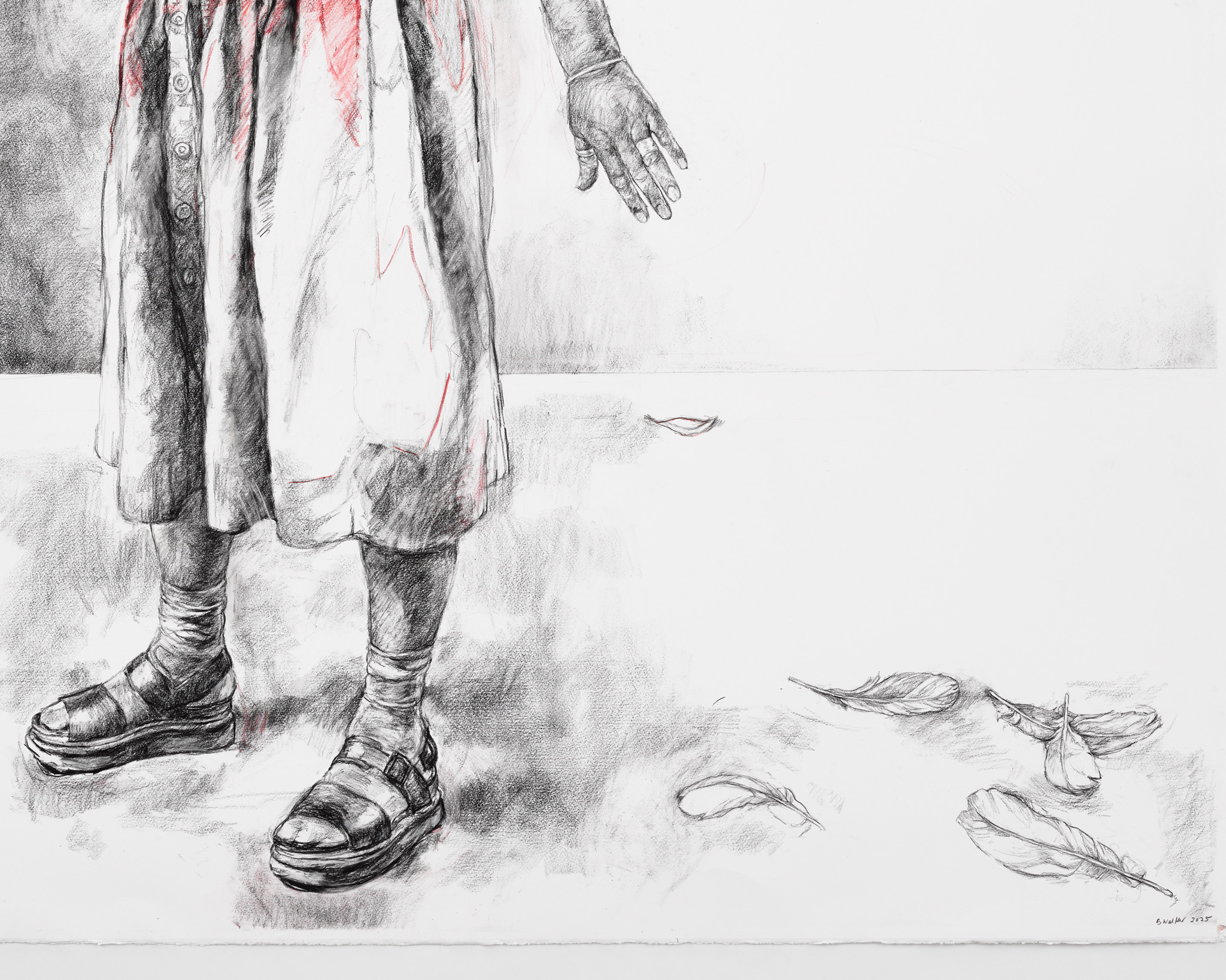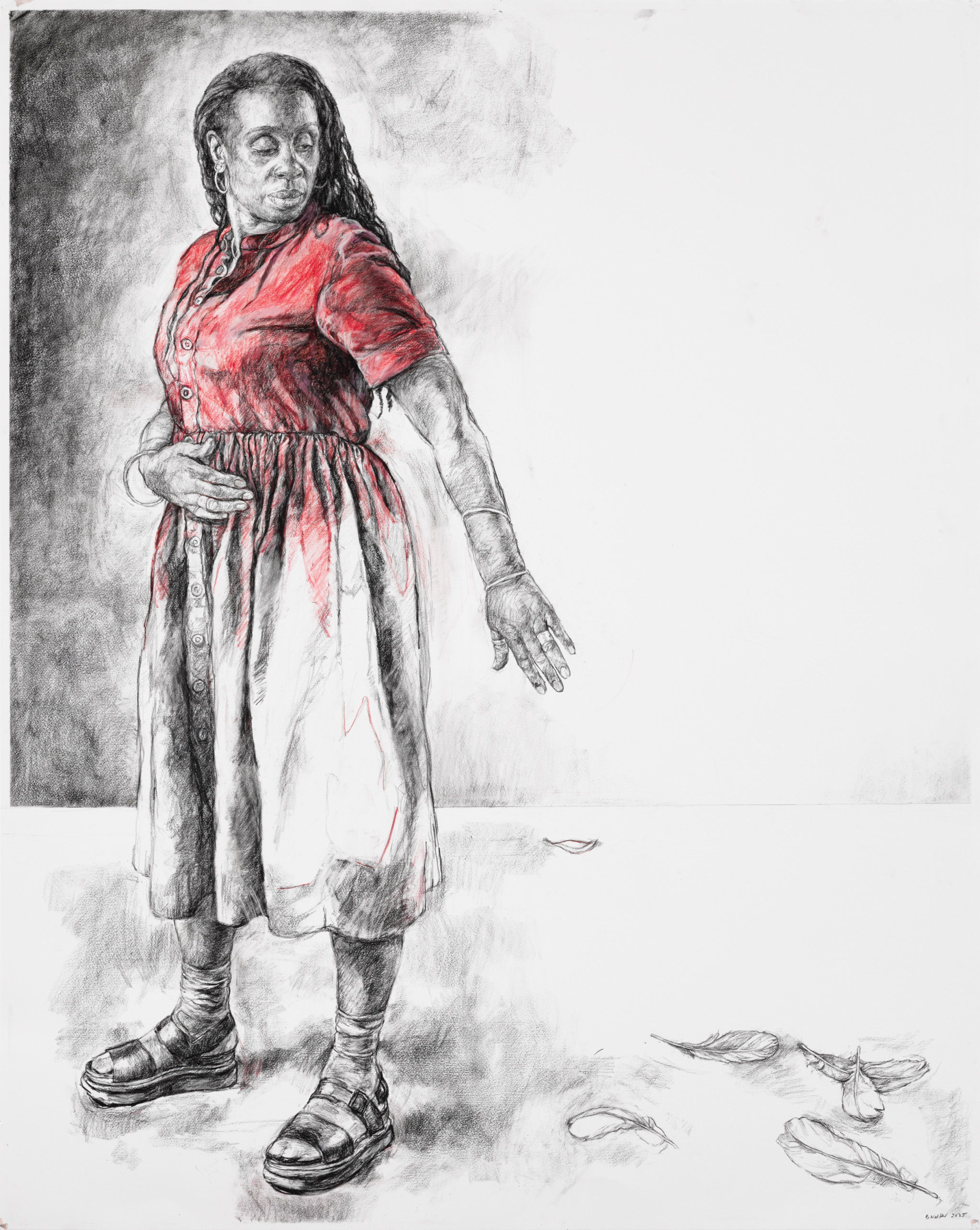 The feathers scattered on the ground, or caught beneath the heel in End of the Affair I and II, can be viewed as a duality: Leda is clinging to the memory of a past relationship while simultaneously asserting her dominance. By literally treading upon these remnants, she proves she is finally in control. While the title is an ironic nod to Graham Greene’s novel, these specific works serve as a profound reclamation of power. By merging the personal with the political, Walker transforms a centuries-old myth into a contemporary statement of defiance, where the ghost of the past is no longer an oppressor but a trophy of her own resilience.