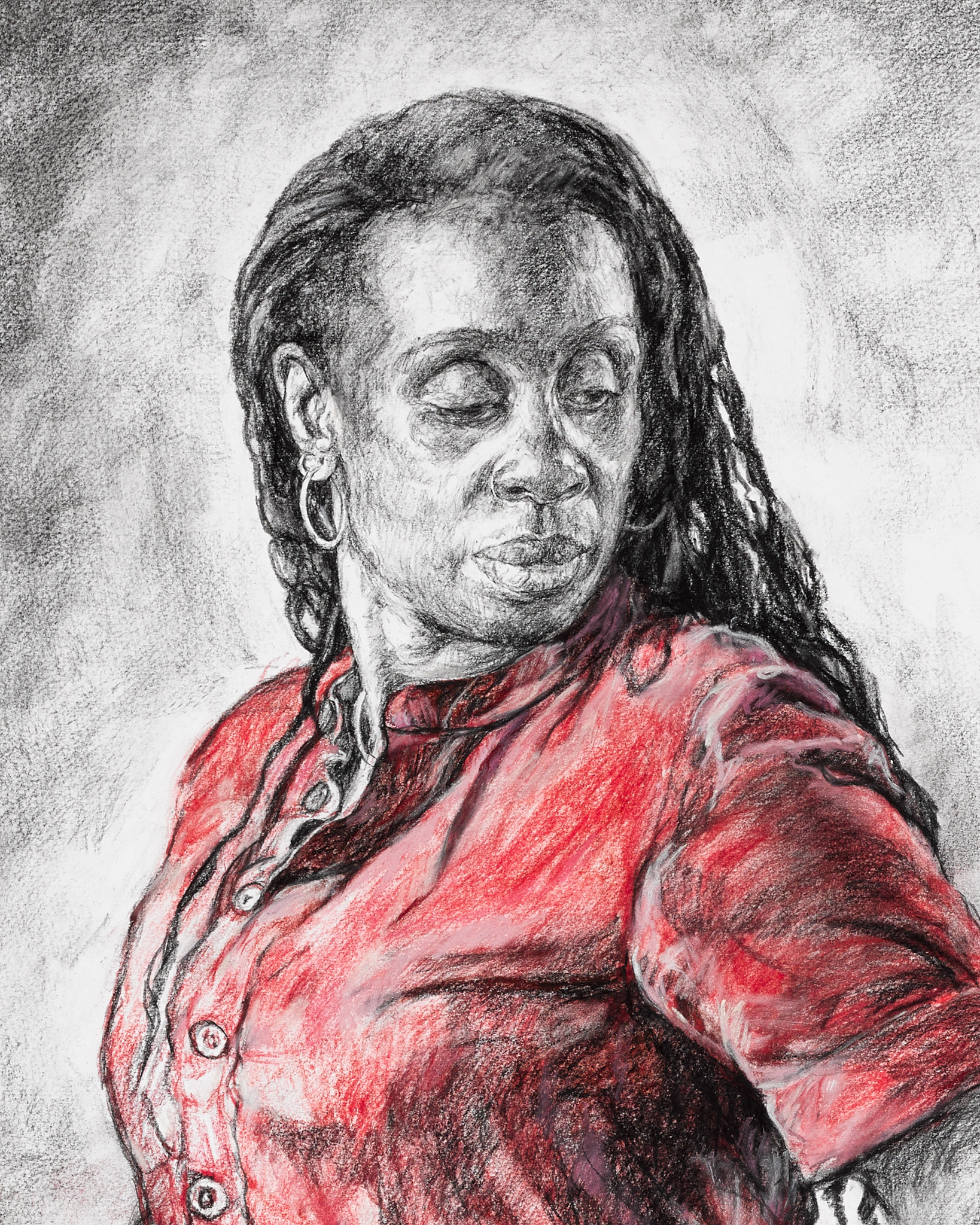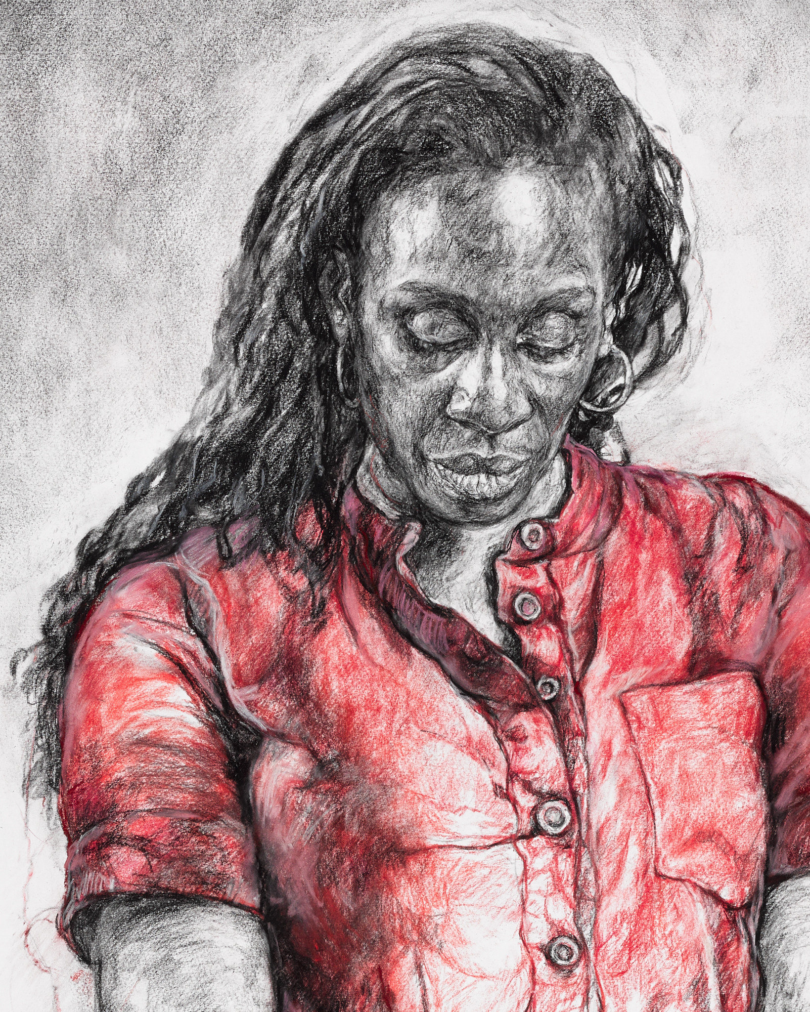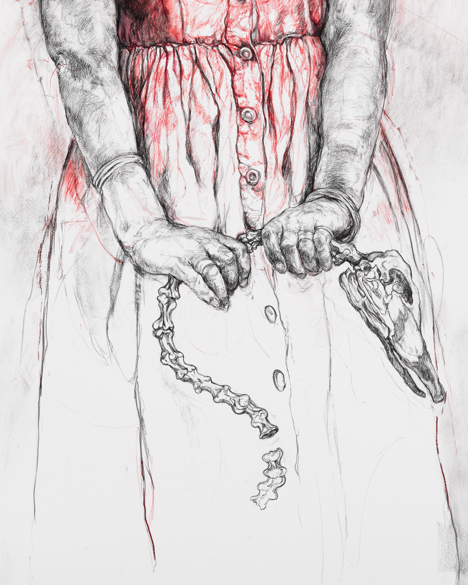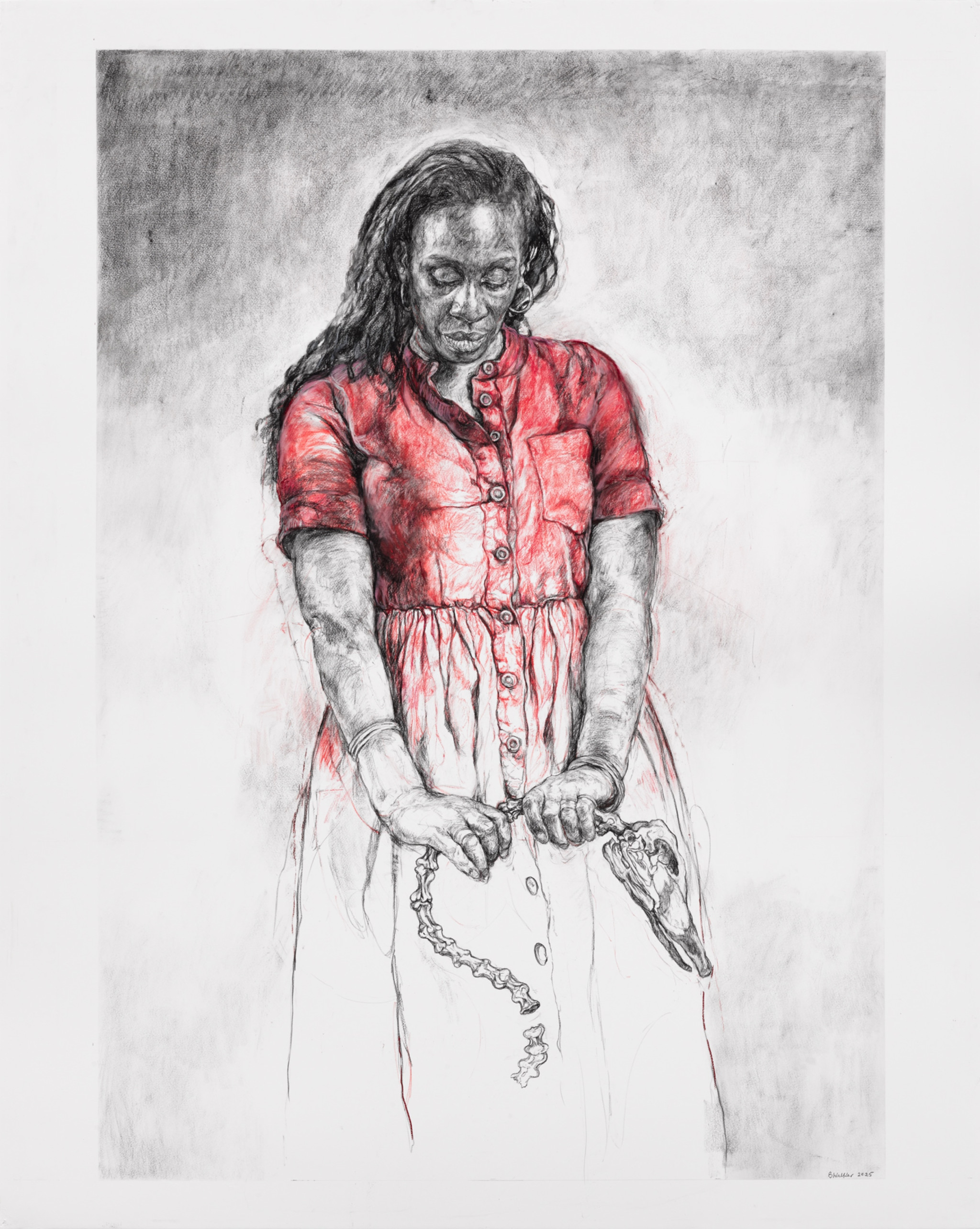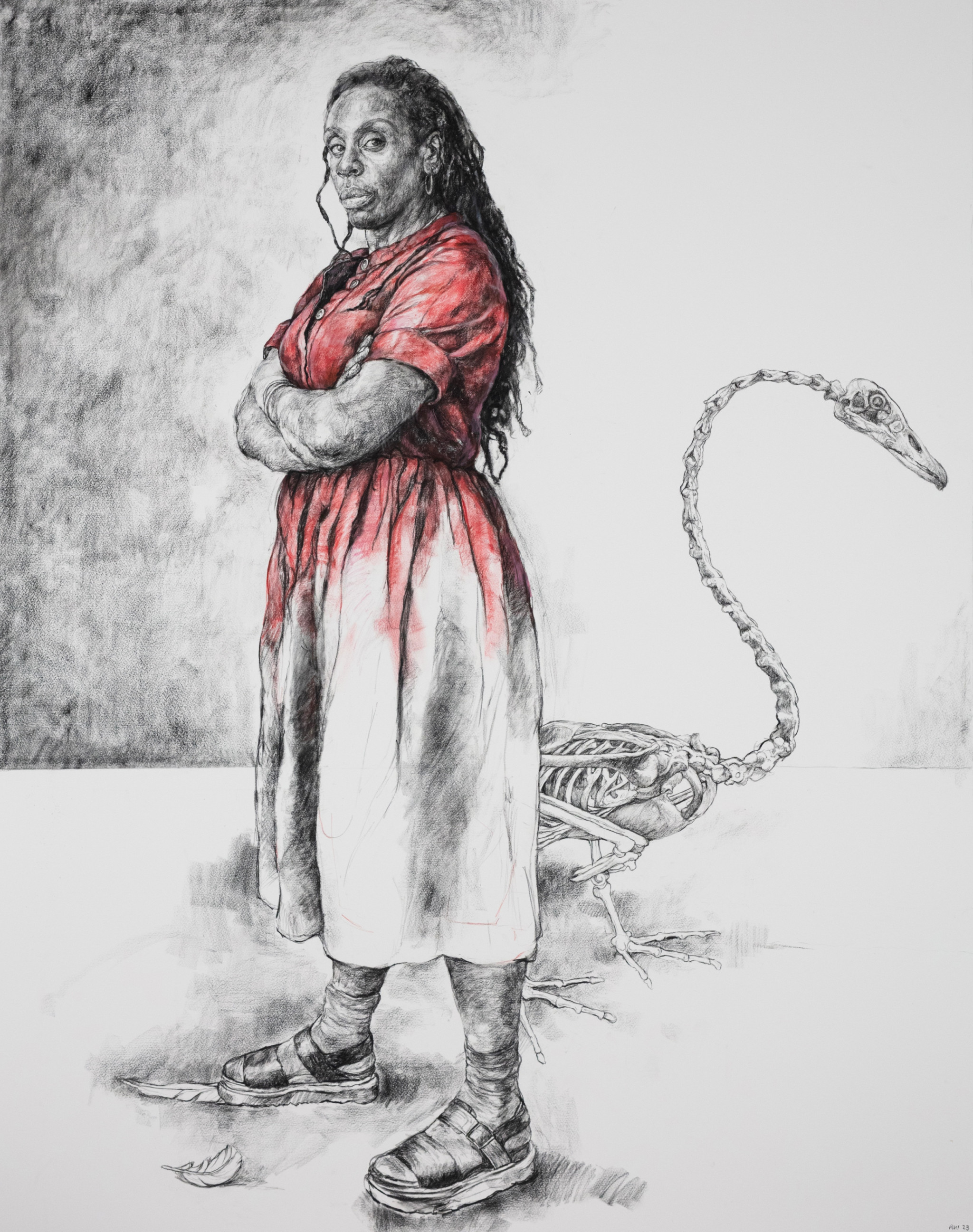 'Leda' is moving away from the swan, who is represented as a skeleton. He has changed, and her attitude towards him has changed also. He no longer has any power over her. Before he was a beautiful creature; now he is just an ossified specimen. The drawing is partly autobiographical: Leda is me thinking about a past relationship. I made a conscious decision to put myself in the frame. But it’s also about relationships in general, focusing on who we are and what we possess and desire. I was also looking at whiteness; in depictions of Greek mythology, you’ll never see a Black figure in the central role, so I wanted to subvert the ideology by putting myself as the central figure. I also removed the white plumage of the swan and rendered him as a skeleton, no longer living but bone-white instead."